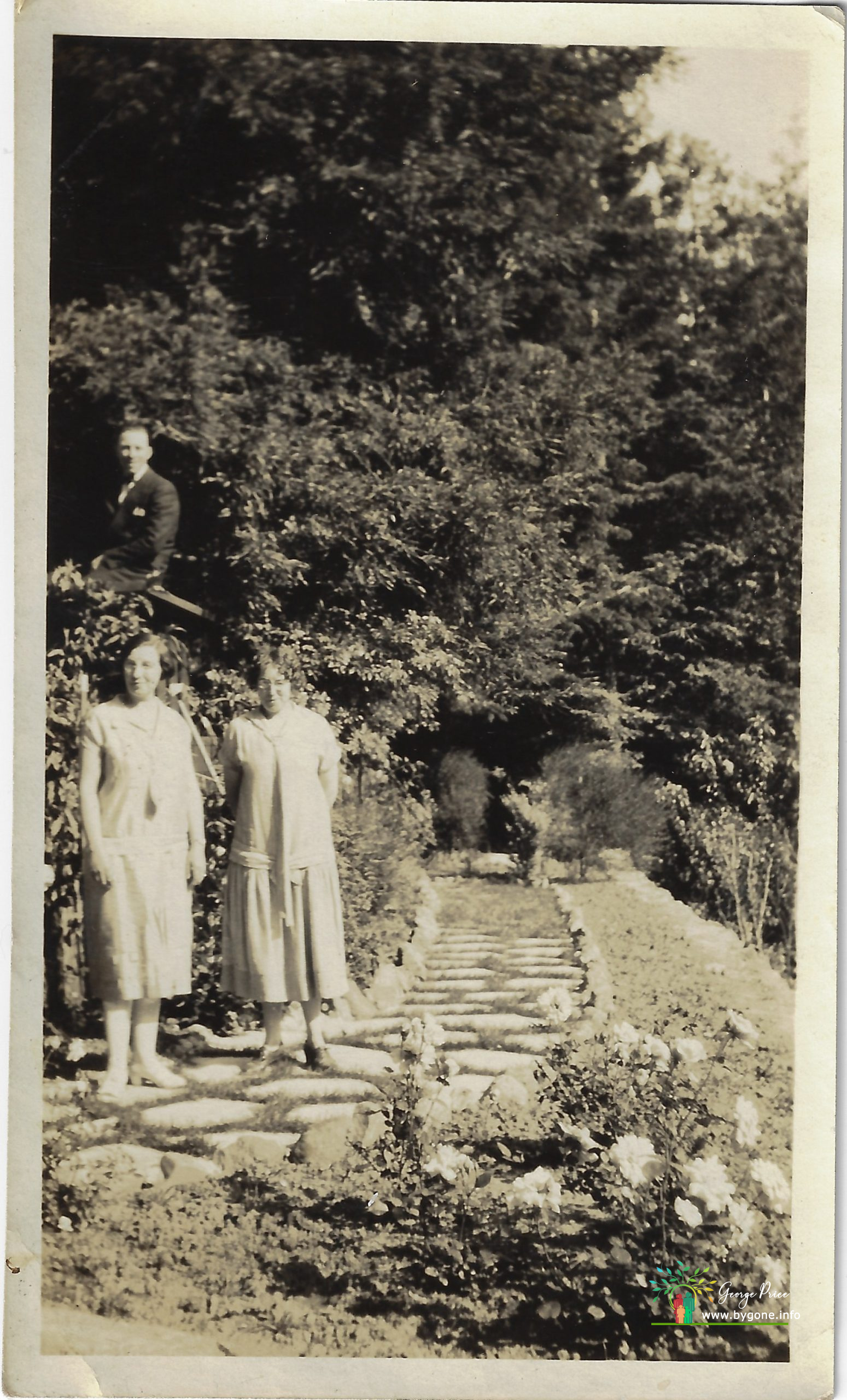 Written on back: “Maud & Tee with Walter at back. This was taken on McNear’s front porch, note the concrete slabs that we are standing on. Walter put them in last winter. There is green grass between the slabs.”