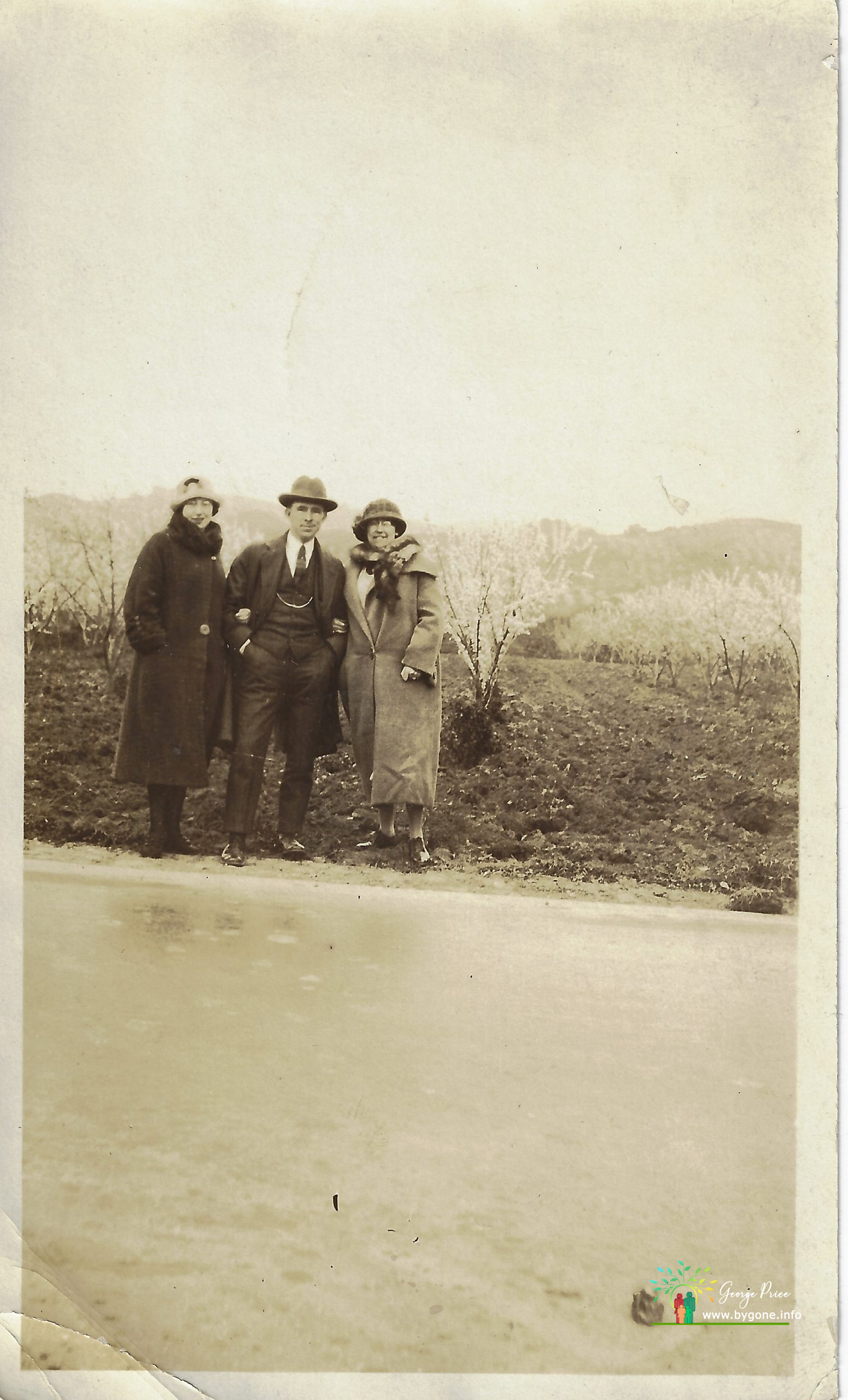 Written on back: “This is Walter, Mrs Roberts and myself [Christina] taken one Sunday about an hours ride from San Francisco. Note the fruit trees behind us.”