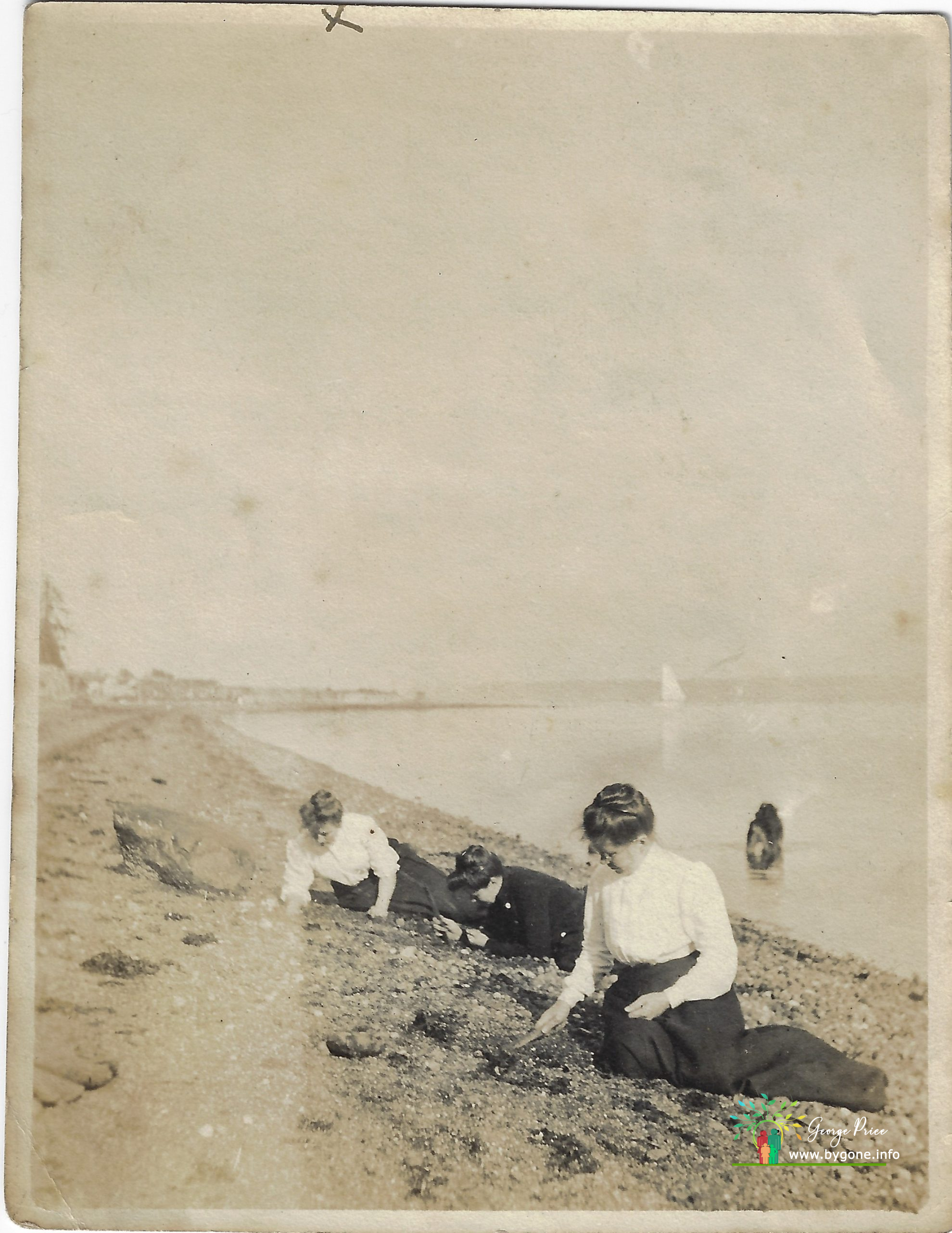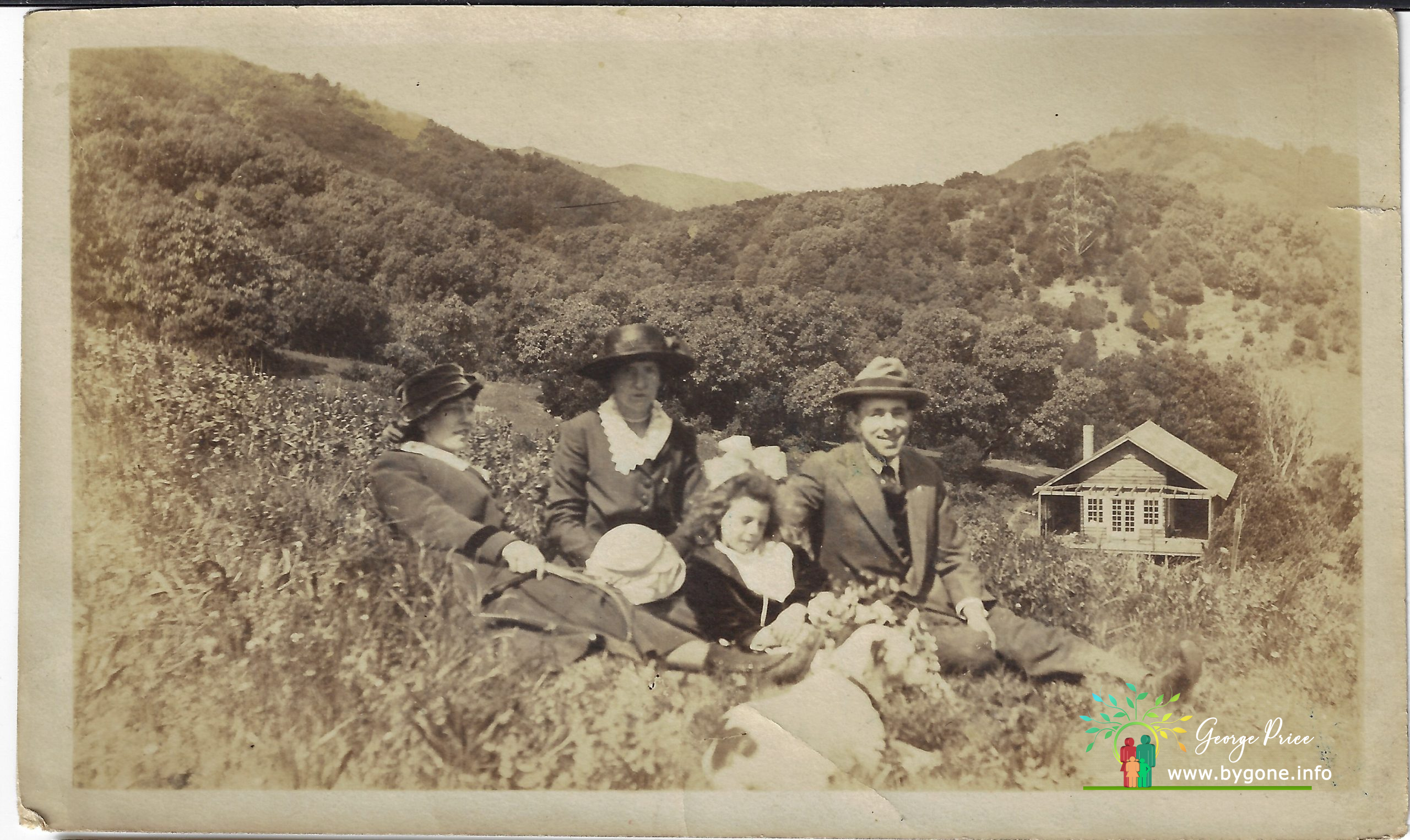 Written on back: “Dear Mum, this is a photo of Teenie, me and the brothers wife & there little girl taken last summer down in the country. This is were we are going to take Teenie to get the beach hut. Wal”