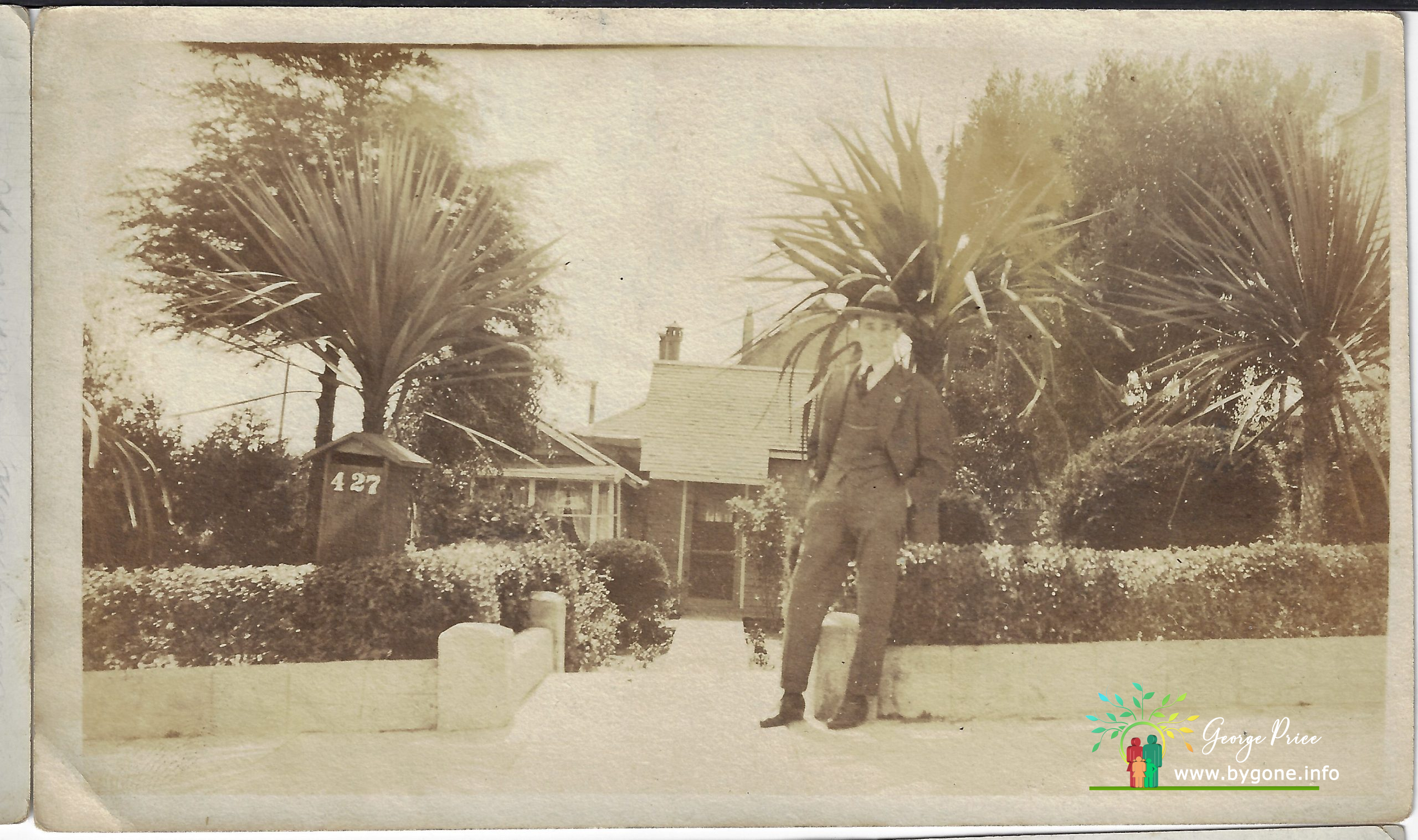 Written on back: “Dear Mum this is the photo of our little cottage & that suppose to be me in the front. These were taken last year but could not wend them on account of the closing. Walt” [Walter Tutty]