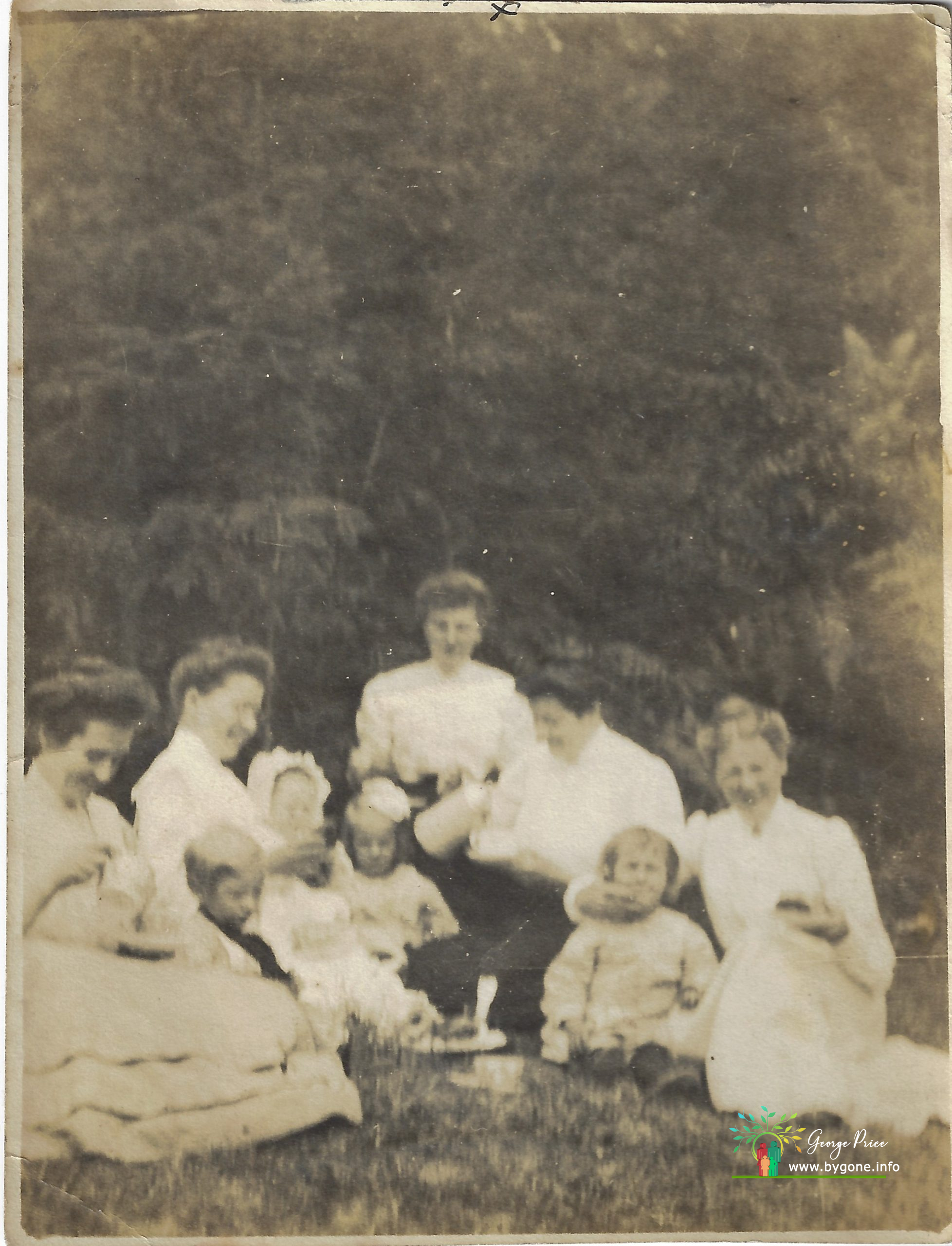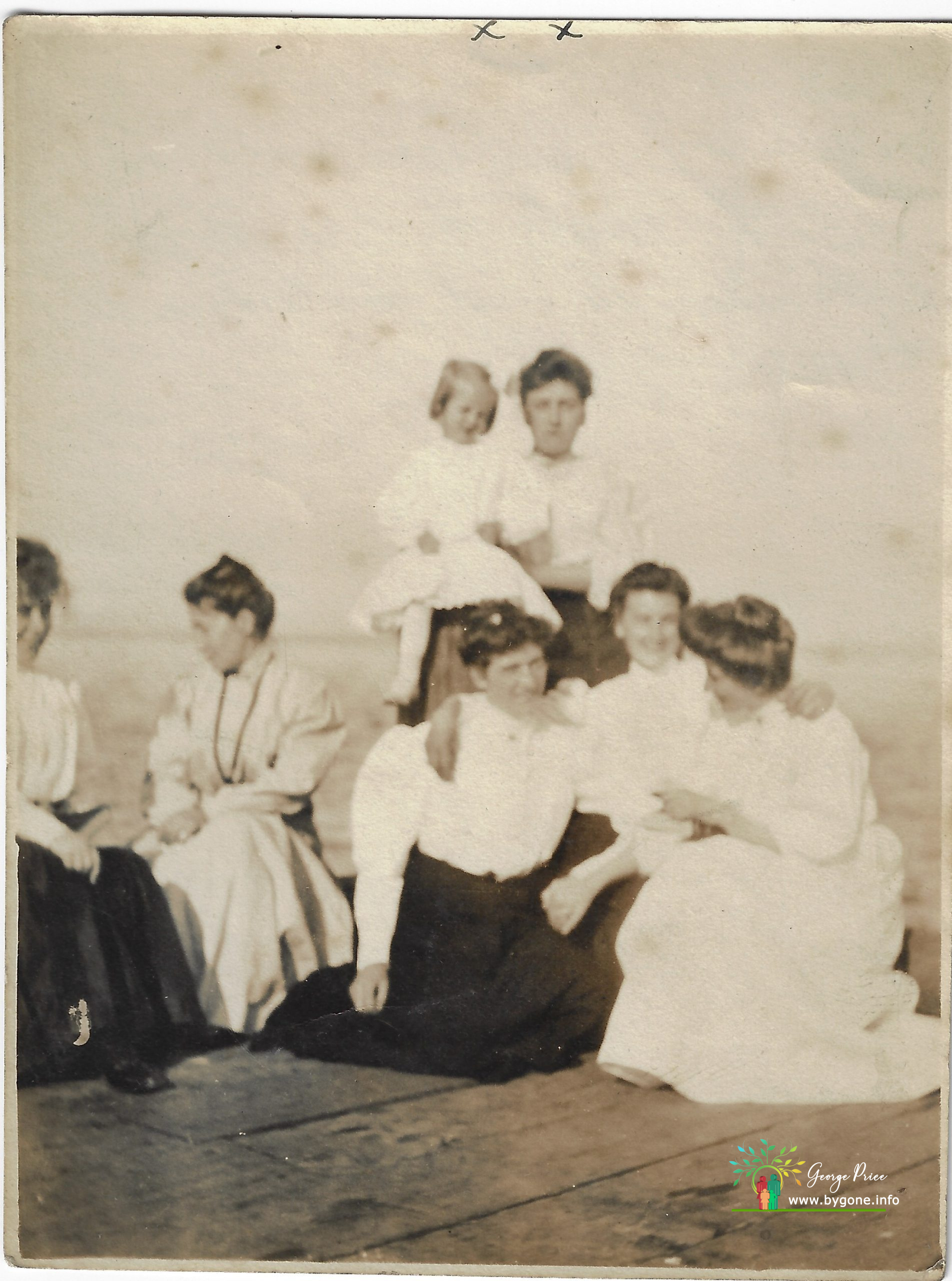 Written on back: “This was taken over at the country, we are all sitting at the end of the dock. Little Maudie and me where the crosses is. “